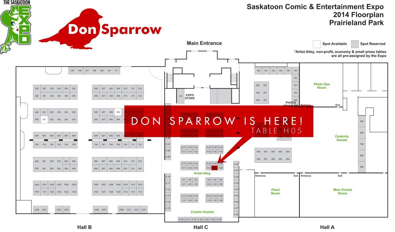 Hey friends! I’ll be appearing this month in my own hometown at the 2nd Saskatoon Expo! I couldn’t be more excited. Here’s where to find me—table H05. Thanks to the organizers for the great map, and also for seating me next to my old pal Kyle Fast, a fellow veteran of these conventions. See you at Prairieland Park on September 20th!
